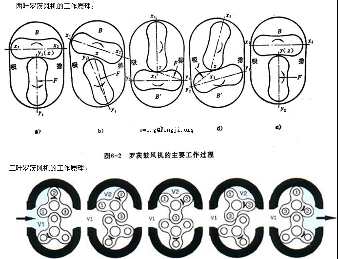 罗茨风机分卧式和立式两种。卧式罗茨风机,它由两个渐开腰形转子(空心或实心)、长圆形机壳、两根平行轴组成。机壳可分为带有水冷、气冷和不设冷却装置三类。传动机构是在两轴的同端装有式样和大小完全相同的、且互相啮合的两个齿轮,使主动轴直接与电动机相连,并通过齿轮带动使从动轴作相反方向的转动。每个转子旋转一周,能排挤出两倍阴影体积的空气,因而主动轴每旋转一周就排挤出4倍阴影体积的空气。罗茨风机进、出口合理的布置应为:上端进风下端排风(对卧式而言),这样可以利用高压气体抵销一部分转子与轴的重力,降低轴承压力,减少磨损。